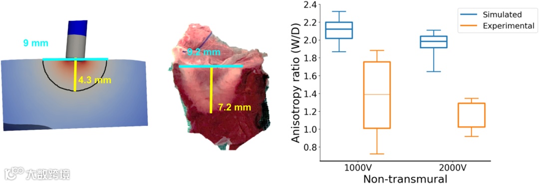 透壁损伤:在右室中,模拟宽度与实验相符的阈值范围为550–760 V/cm(2000 V)与900 V/cm(1000 V)。