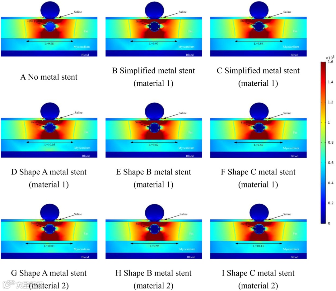 本研究通过三维有限元建模系统分析了不同形状与材料的冠脉金属支架对PFA消融效果的影响。结果表明: