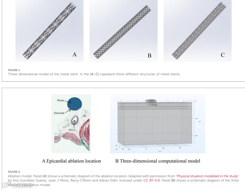然而,临床实践中常遇到患者冠状动脉内置入金属支架(Metal Stent, MS)的情况。金属支架具有高电导率,可能对消融区域的电场分布和热分布产生影响,进而影响消融效果。尽管前期研究已证实MS会引起电场畸变和局部温升,但关于其不同形状和材料对PFA效果的系统性研究仍较为缺乏。因此,本研究通过建立三维有限元模型,系统分析不同形状与材料的金属支架对PFA过程中电场分布与温度分布的影响。