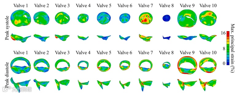 峰值收缩期和峰值舒张期瓣膜配置的十个瓣膜中的最大主应变