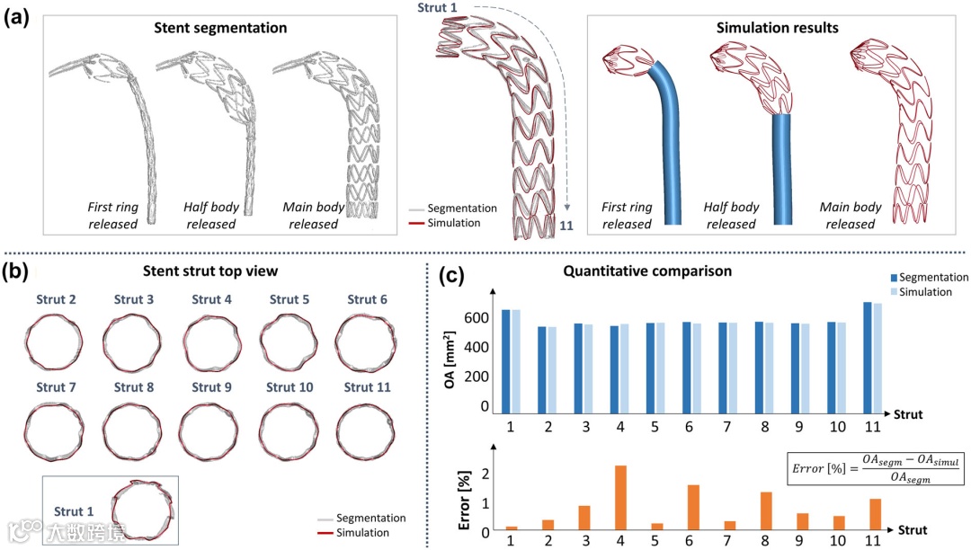 3.2 CT 扫描与比较:将 Device C 植入 3D 打印的主动脉模型中,在 CT 扫描下进行释放操作并获取四个不同时间点的扫描图像。使用 VMTK 软件对支架进行分割,并与模拟结果进行定性和定量比较,包括评估支架环的开口面积(OA)及计算其与模拟结果的百分比误差,以及计算数值模拟与图像分割所获得的每个支架丝之间的最大绝对距离以评估支架丝的对齐情况。