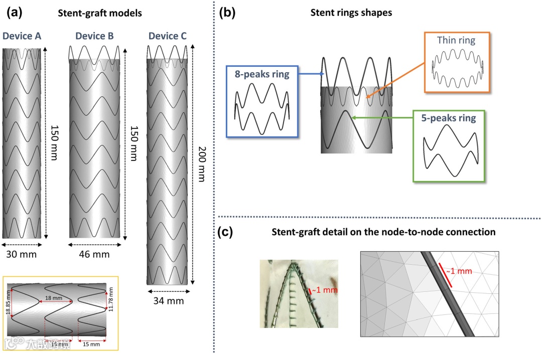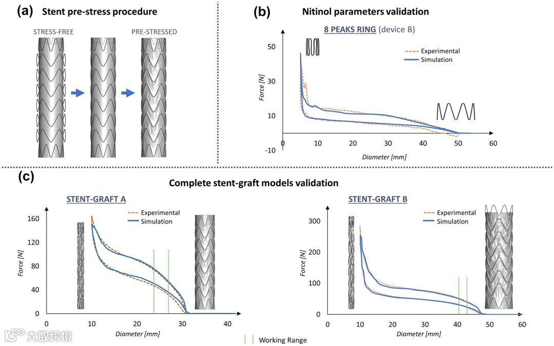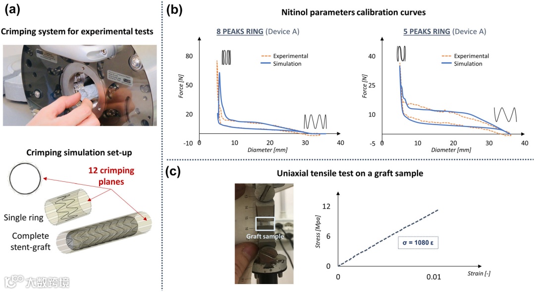1.2 对于支架材料镍钛合金,去除 Device A 和 B 的缝线后取出单个支架环进行压接 / 释放实验(37°C ± 2°C),获得径向力 - 直径曲线。数值模拟中,采用 2 节点(线性)梁单元对支架环进行离散化,并基于 Auricchio 和 Taylor 提出的超弹性镍钛合金公式建模,通过与实验对比校准镍钛合金参数。对于覆膜材料 PET,对其样品进行单轴拉伸试验至断裂,结果显示其在拉伸时呈线性弹性行为,纵向杨氏模量为 1080 MPa,模拟中采用线性各向同性弹性织物材料建模,压缩刚度设为零,泊松比设为 0.3523。