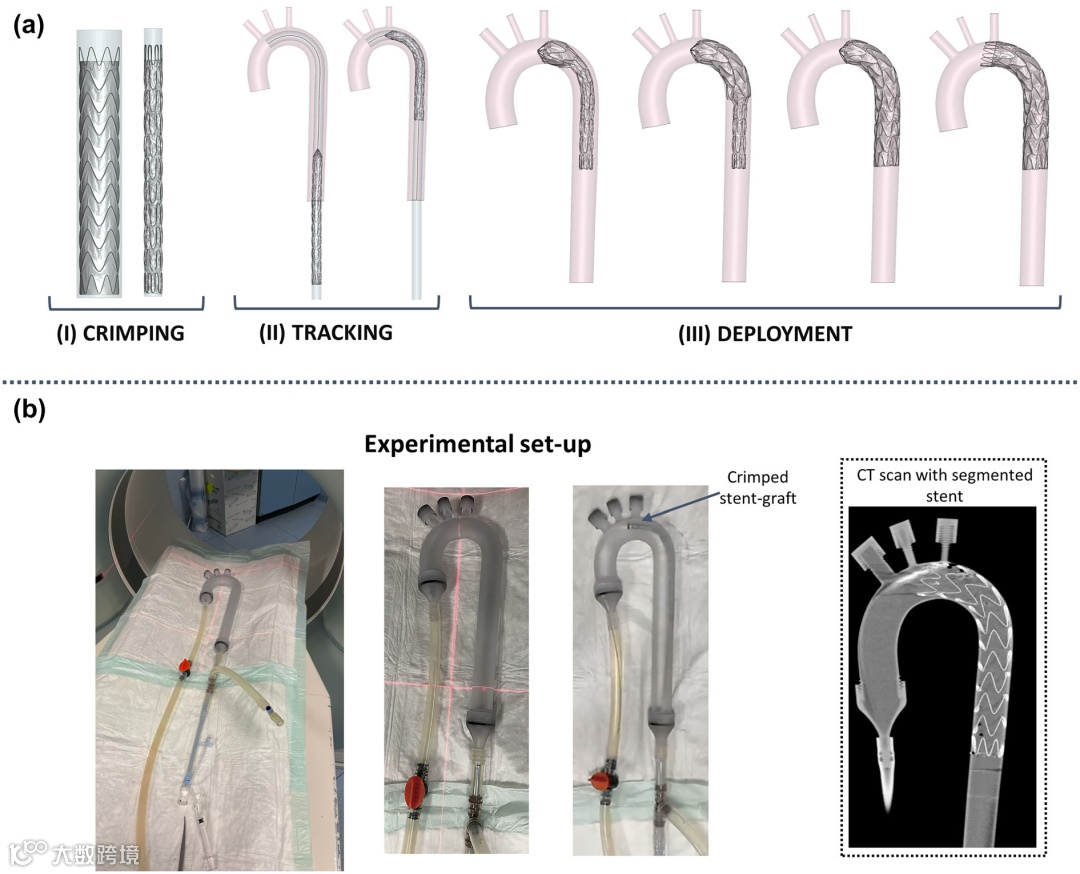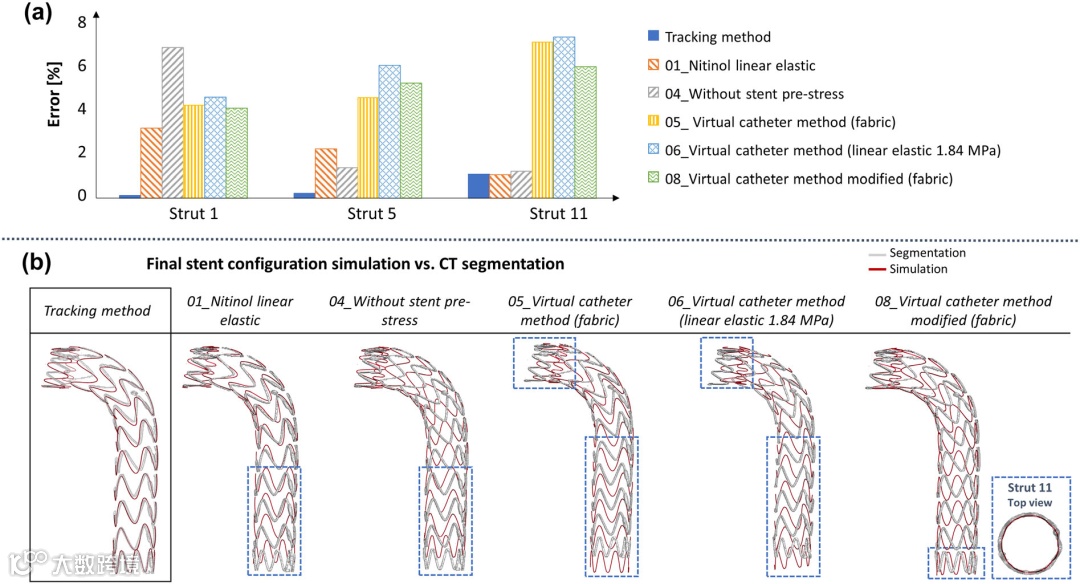 研究结论:模型验证结果良好:通过对单个支架环和完整覆膜支架模型的压握测试验证了材料参数的有效性,在覆膜支架的工作范围内,实验与校准曲线的误差较小(Device A 加载路径误差为 2.6 ± 1%,卸载路径为 4 ± 1.8%;Device B 加载路径为 1.54 ± 0.24%,卸载路径为 1.9 ± 1.8%)。在理想化主动脉中的释放验证表明,仿真结果与 CT 图像在定性和定量上均有良好的一致性,支架环扩张和覆膜支架整体最终释放长度能被数值仿真模型正确获得,每个支架丝的仿真与CT图像分割的最大距离与支架丝直径相比误差低于 4%,支架环的开口面积误差始终低于 2.5%(平均 0.92%)。