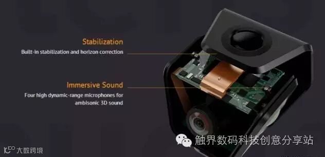 内置稳定系统,自动校正抖动和水平方向,4个高动态麦克风实现3D声场录制,这意味着声音能根据用户的观察方向自动映射。