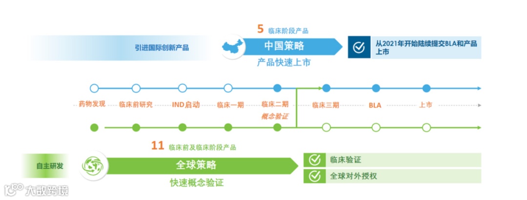 自创立起,天境生物就要做有Best-in-Class及First-in-Class潜力的创新药,方向聚焦在肿瘤免疫和自身免疫疾病领域。它建立了独有的商业模型——产品引进+自主研发,即建立快速面向市场的“中国管线”和具有突破性潜力的“全球管线”。简单来说,中国管线主要专注于从全球生物制药企业寻求针对试验用药物在大中华地区的开发以及商业化授权引进机会;而全球管线则主要专注于在美国地区推动公司自己的创新性或差异化生物药进入临床验证阶段。目前,中国管线五类,全球研发管线有六类。