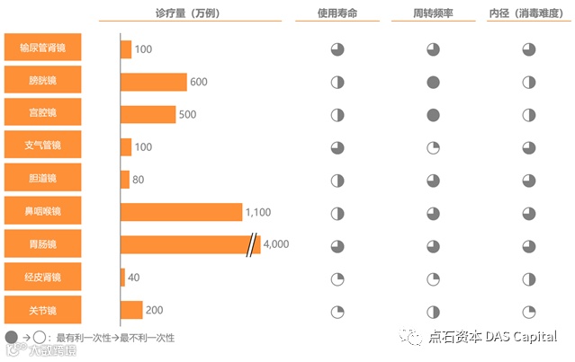 从一次性内窥镜的使用寿命、周转频率、消毒难度来考虑,购置、维修、消毒成本较高,单次使用时间较短,周转频率快的内窥镜,均有“耗材化”的潜力,这些镜种对应了中国近7,000万例的潜在诊疗量,给国产一次性内窥镜公司留下了一片蓝海市场。