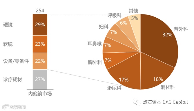 中国内窥镜市场按产品类型拆分,除了硬镜、软镜镜体,还包含相对应的设备、零备件,以及内窥镜专用的诊疗耗材。剔除手术耗材的影响,按科室细分,普外科占内窥镜市场比例最大,对应腹腔镜、胆道镜等,消化、泌尿比例次之,分别对应胃镜、肠镜、十二指肠镜及输尿管镜、经皮肾镜、膀胱镜等镜种。