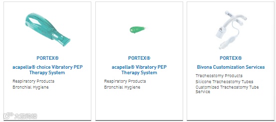 产品包括振动PEP治疗系统、气管切开插管、带套囊的新生儿和小儿硅胶气管切开插管、套囊上方粘液抽吸气管(内)插管、湿热交换器等。