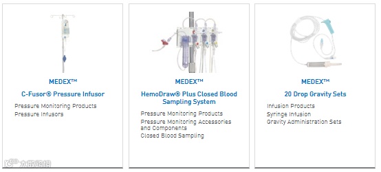 MedexTM产品包括血压检测压力传感器系统,充气注射系统,无针阀,压力传感器系统,小口径扩展组件、压力线、旋塞阀、导管、控制注射器、盖帽等。
