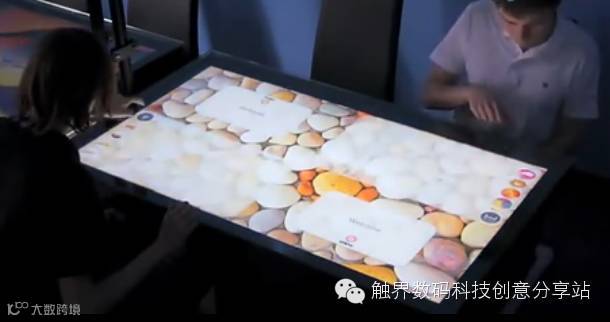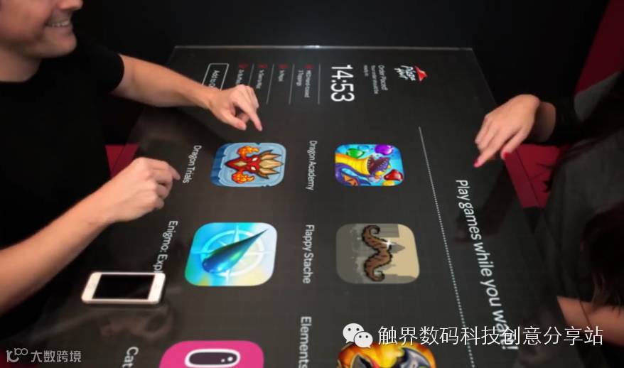 这个神奇餐桌还可以在客人等餐的时候,用触屏桌子玩游戏、看新闻及跟别的餐桌的客人聊天等等。另外,还可以将屏幕挂在餐厅的墙壁上,一方面可以倾销自己的产品,另一方面可以做广告。