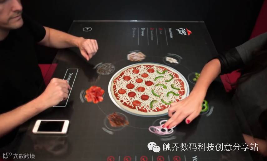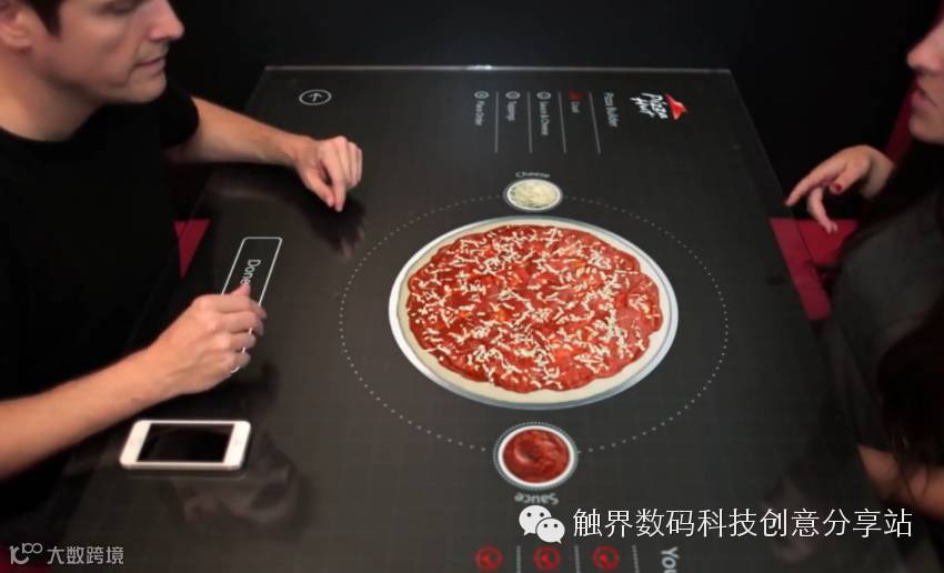 必胜客与Chaotic Moon Studios一起合作,推出了一款新形态的互动式点餐桌,通过这张互动式触控桌,消费者能通过智能手机与桌面连接,并参与披萨饼皮、饼的大小尺寸、馅料配料等决策过程。