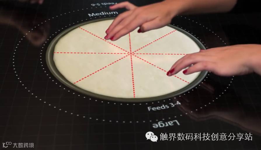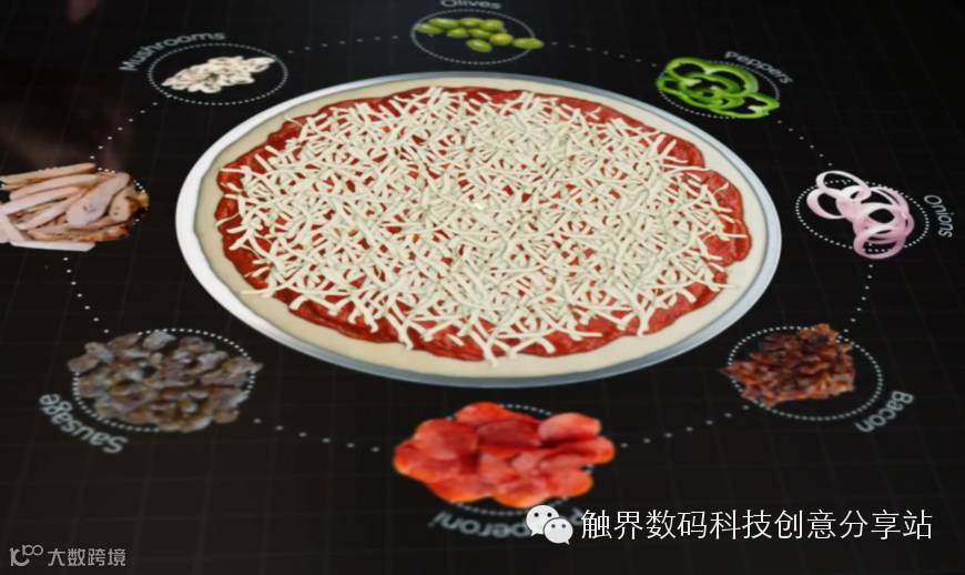 过去我们吃披萨时经常会疑惑究竟9寸或12寸、16寸饼皮差多少?可是9、12、16寸到底实际中的大小是什么样子呢,在这互动式点餐桌上,实际饼皮大小会1:1显示在桌面上,通过两指缩放便能改变披萨尺寸,这样就很直观的感受啦!