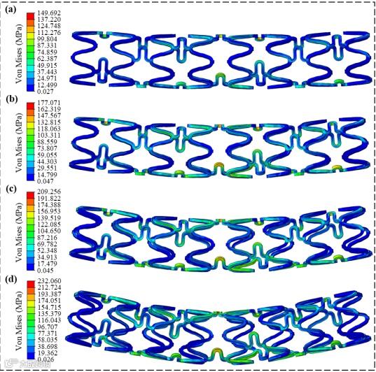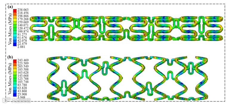 1. 压握与扩张性能:最大等效应力 压握过程中为238.1 MPa,扩张过程中为243.5 MPa,均低于WE43的极限抗拉强度(370 MPa),说明支架在植入过程中不会发生断裂,微凸台结构有效缓解了应力集中,提高了结构可靠性。
