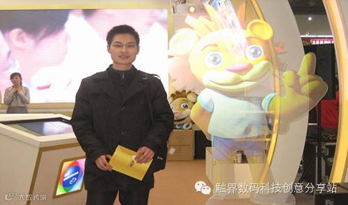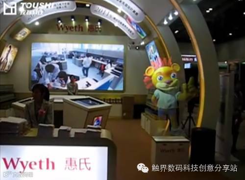 在惠氏Wyeth整个展位入口处,放置了惠氏奶粉的吉祥物小狮子形象,通过全息成像技术,小狮子背投透明显示在空中,成为虚拟讲解员,微笑可爱地面对着观众,刚观众走进惠氏展位入口处时,小狮子就会主动开始跟观众打招呼,并开始介绍美国惠氏和奶粉产品;当观众离开感应区域后,悬浮在空中的小狮子虚拟形象会自动停止解说,再次微笑面对观众。