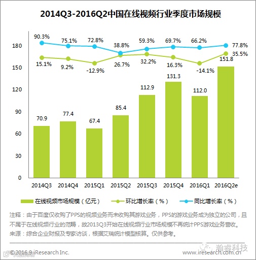 2016Q2,中国在线视频季度市场规模为151.8亿元,同比增长77.8%,环比上涨35.5%。整体市场除季节性规律上涨外,部分视频企业终端销售规模的迅速扩大,也带来较大的营收增长。