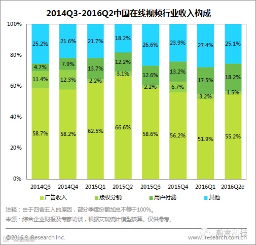 2.在线视频行业收入构成:广告占55.2%居首位,用户付费比例平稳上升