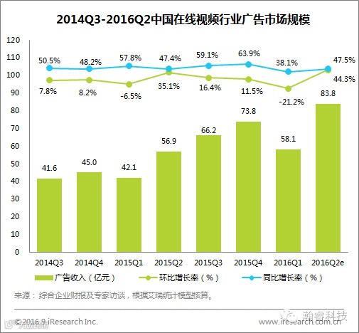 2016Q2,中国在线视频广告市场规模为83.8亿元,同比增长47.5%,环比上涨44.3%。除上个季度外,广告收入一直保持高于45%的同比增长。《互联网广告暂行管理办法》的发布使得视频贴片广告的优势进一步显现,未来视频广告收入仍会保持较高速率增长。