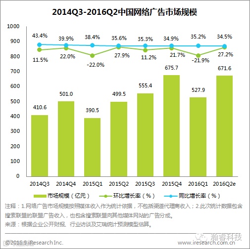 2016Q2,中国网络广告季度市场规模为671.6亿元,与去年同期相比增长34.5%,环比增长率为27.2%,仍保持较快的增长水平。