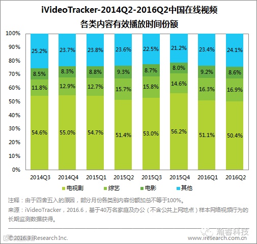 2016Q2,综艺及其他视频内容步步蚕食电视剧的收视份额,电视剧、电影时长份额均有所减低,本季度占比分别为50.4%和8.6%。综艺类小幅增长至16.9%,保持较平稳增长态势。