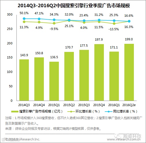 2016Q2中国搜索引擎行业季度广告市场规模为199.0亿元,同比增长率为16.6%,创历史新低,暂时结束了长期以来同比增速高于23%的高位增长状态。同时,环比增加16.3%,低于2009年以来的任一历史同期水平。
