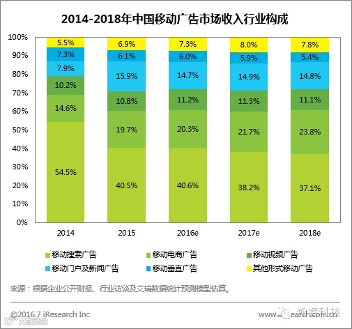 从不同细分市场来看,移动搜索广告为移动端份额最大的广告类型,2015年占比达40.5%,但其份额在近两年呈现出下滑趋势。移动电商广告、移动门户及新闻广告分别为移动端第二、第三大的广告类型,在2015年的占比分别为19.7%和15.9%。艾瑞预计,移动电商广告、移动视频广告在2016年将迎来规模上的增长,在移动广告中的占比将小幅增大。另外,其他形式如原生广告的规模和份额也将提升。移动营销总体结构分布情况,近几年将保持大体上的平衡。