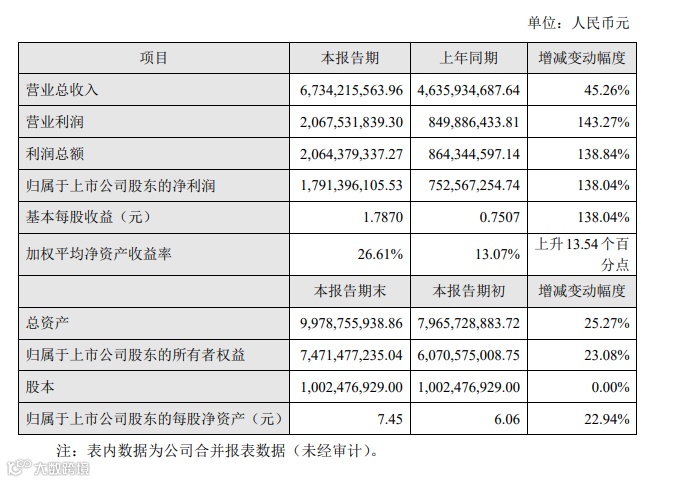 报告期内,公司实现营业收入 805682.68万元,较上年同期增长 3.35%;营业利润223664.41万元,较上年同期增长14.04%;利润总额 229484.16 万元,较上年同期增长11.22%。