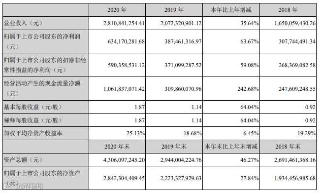 2020年,万孚生物营业收入为2810841254.41元,同比增长35.64%;净利润达634170281.68元,同比增长了63.67.