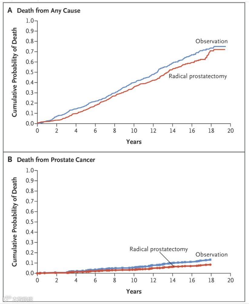 (图:接受手术治疗和仅随访的早期前列腺癌患者死亡率比较)