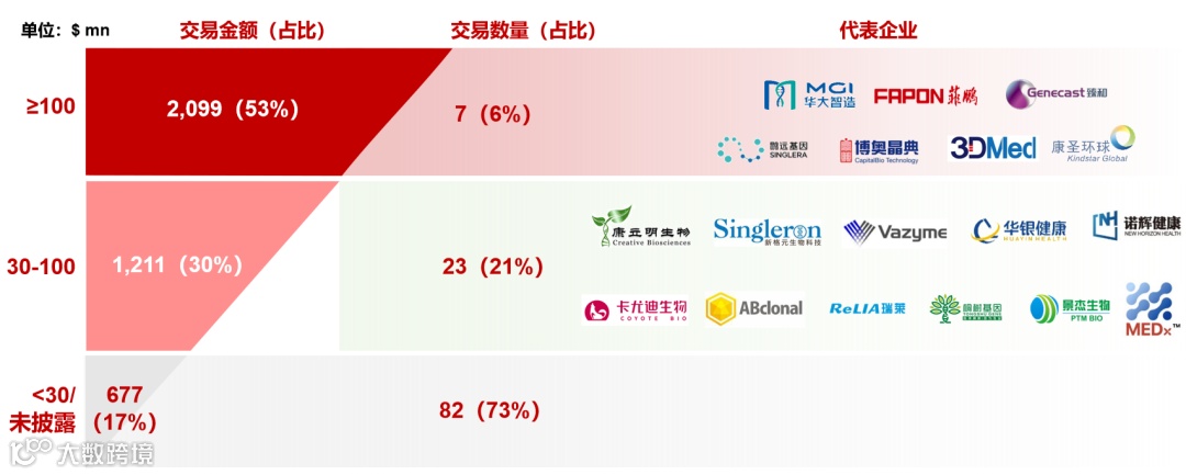 按细分行业看,基因检测的融资事件和融资额都远远领先,尤其肿瘤伴随诊断、肿瘤早筛早诊最受资本青睐。从融资企业看,头部效应加剧凸显。单笔融资金额超过1亿美元的交易共有7笔,占了全年总融资金额的53%。其中华大智造摘得单笔交易金额的桂冠,融资金额超10亿美元。