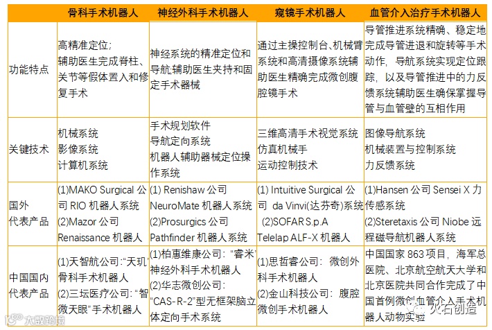 目前,手术机器人已在骨科、脑神经外科、泌尿外科,妇科和普通外科等多个领域有着广泛的应用。按照医疗应用领域划分,可将手术机器人分为骨科手术机器人、神经外科手术机器人、窥镜手术机器人和血管介入治疗手术机器人等。