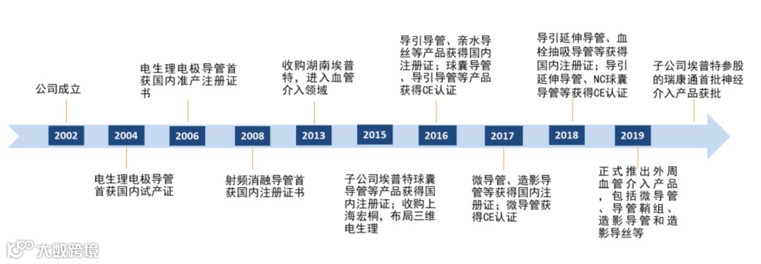 公司于2002年成立,创立之初以电生理业务为主,2013年公司收购湖南埃普特,正式布局冠脉通路业务。2019年公司推出外周介入产品,2020年公司参股的湖南瑞康通首批神经介入产品获批,由此公司实现了以完整冠脉通路和电生理医疗器械为主导,外周血管和神经介入医疗器械为重点发展方向的业务布局。