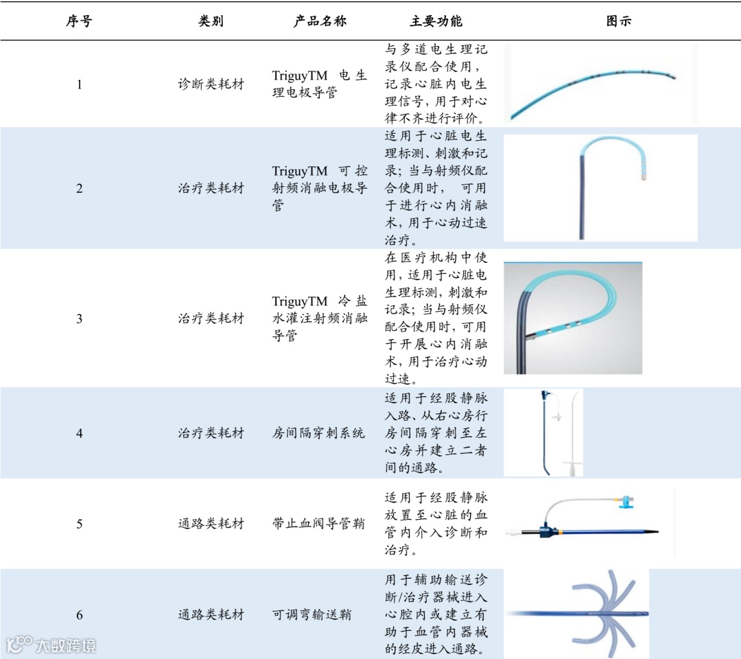 公司电生理产品包括电生理电极导管、可控射频消融电极导管和多道电生理系统,其中电生理电极导管和可控射频消融导管均为国内首家获得注册证的国产产品。电生理产品应用于导管消融手术,分为电生理耗材及电生理设备。电生理手术的目的在于心律失常的诊断及治疗,是通过穿刺股静脉、颈内静脉或锁骨下静脉,将电极导管输送到心腔特定部位,先检查及定位引起心动过速的异常位置,然后在该处进行局部射频消融,以达到阻断心脏电信号异常传导路径或起源点的介入诊断治疗技术。