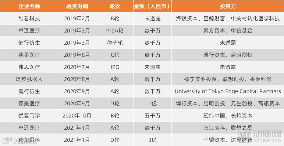 根据动脉橙数据库显示,从2019年截止至今,运动康复领域共发生11起融资事件,总融资金额约为8亿人民币,其中邦尔骨科在2021年1月获得3亿元融资,成为近两年来单笔最高融资。而卓道医疗、德美医疗、健行仿生接连完成两轮融资,展现出了极佳的市场潜力。另一方面,由于运动康复还属于新兴赛道,融资轮次主要集中在A轮,但不可否认的是,随着技术的不断优化及市场需求的激增,越来越多的资本力量将逐步向其聚拢。