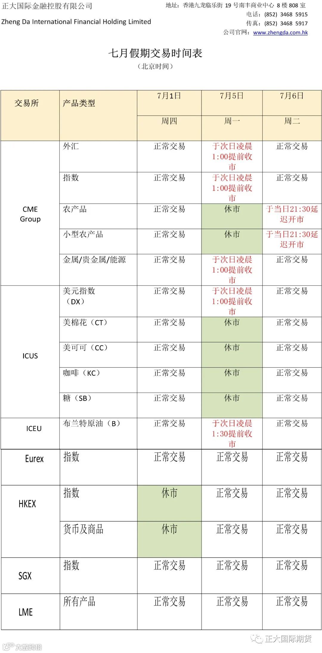 (以上期货交易时间仅供参考,且交易所有可能随时更改交易时间,本公司不保证此交易时间之准确性。客户可自登陆各交易所网站查询最新之交易时间安排。具体时间以交易所为准。由于交易时间及交易所规则问题而导致客户损失,本公司将不承担任何责任。)