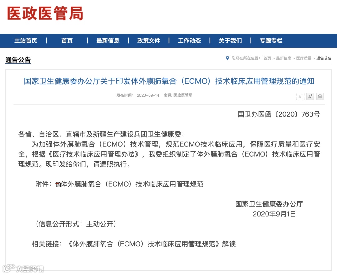 近日,国家卫生健康委网站发布了《体外膜氧合(ECMO)技术临床应用管理规范》(下文简称《规范》),这是国家卫健委首次就一项呼吸支持技术制定规范。