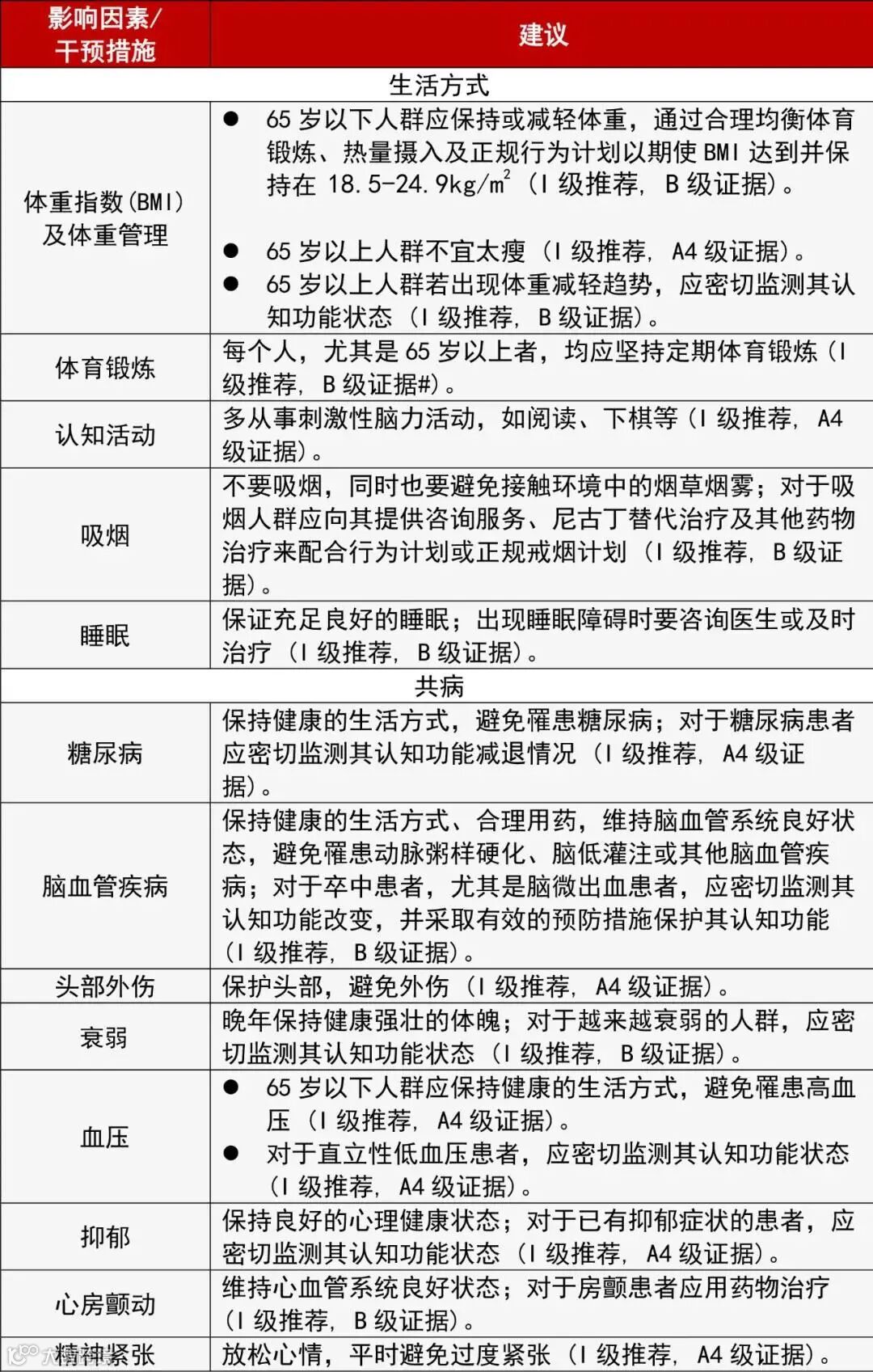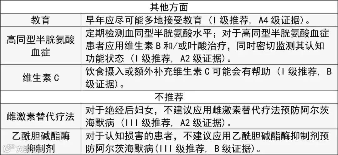 表1:阿尔茨海默病预防指南:初步临床推荐