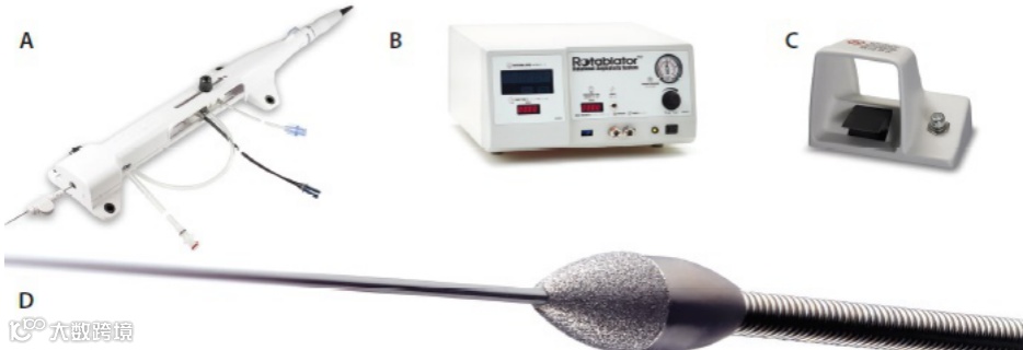 Rotablator外周血管旋磨系统,包括推进器(A)、主机(B)、脚踏板(C)与旋磨头(D)