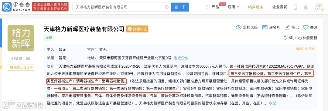 需要注意的是,格力总公司也于几个月前,增加了医疗器械业务。