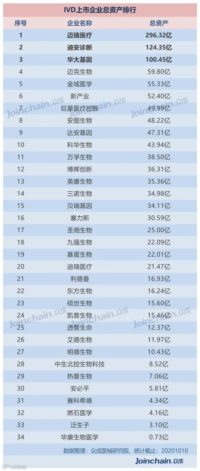 在总资产上,迈瑞医疗以接近300亿元,排名第二的迪安诊断与排名第三的华大基因,净利润均超过100亿元。