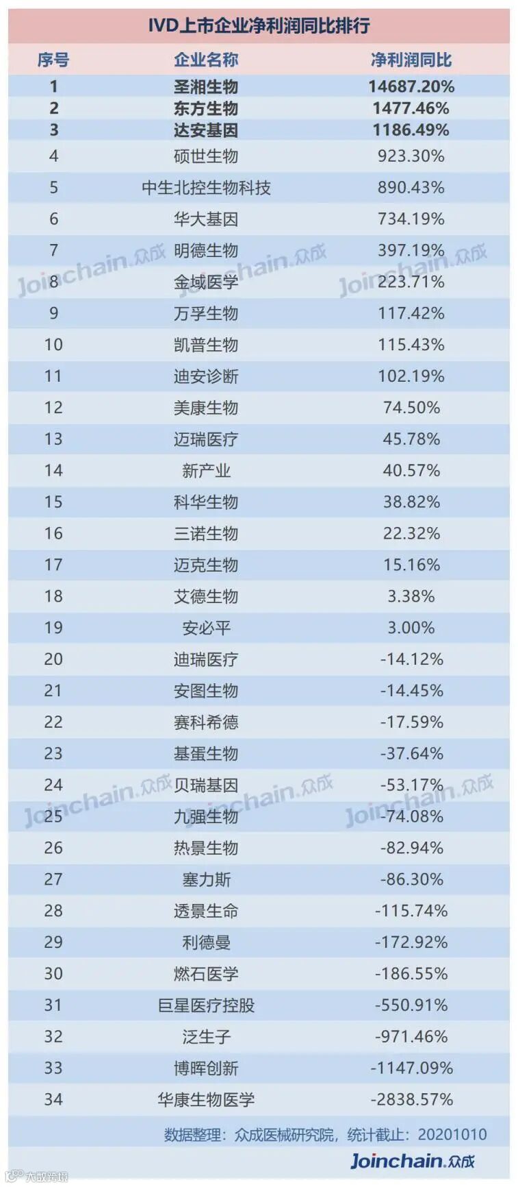 在净利润同比上,圣湘生物以超14000%的净利润同比位居榜首,排名第二的东方生物与排名第三的达安基因,净利润同比均超过1000%。