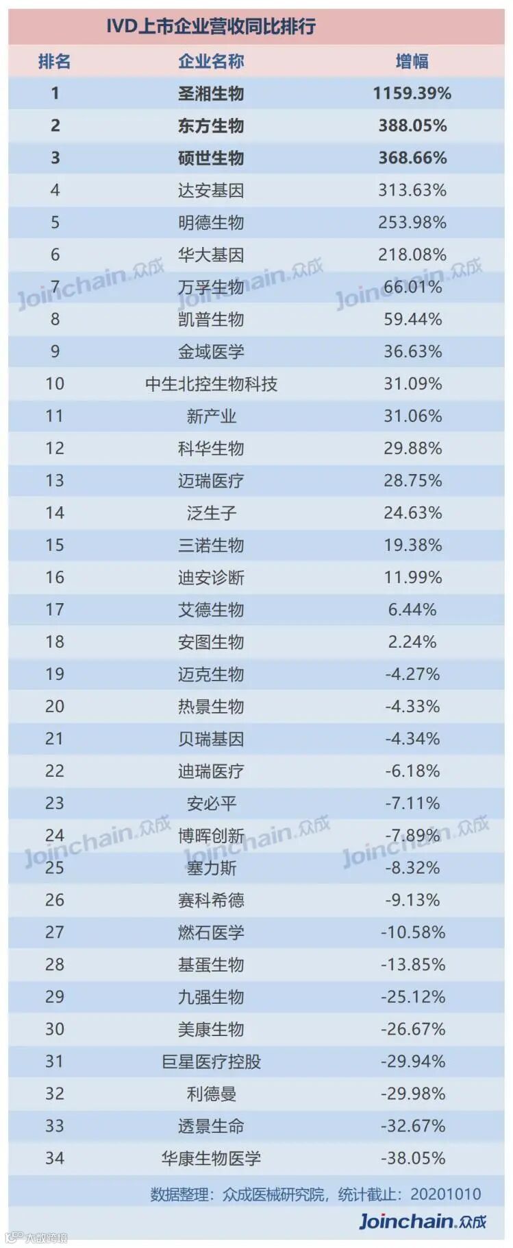 在营收同比上,圣湘生物以超1000%的增幅位居榜首,排名第二的东方生物与排名第三的硕世生物,增幅均超过350%。