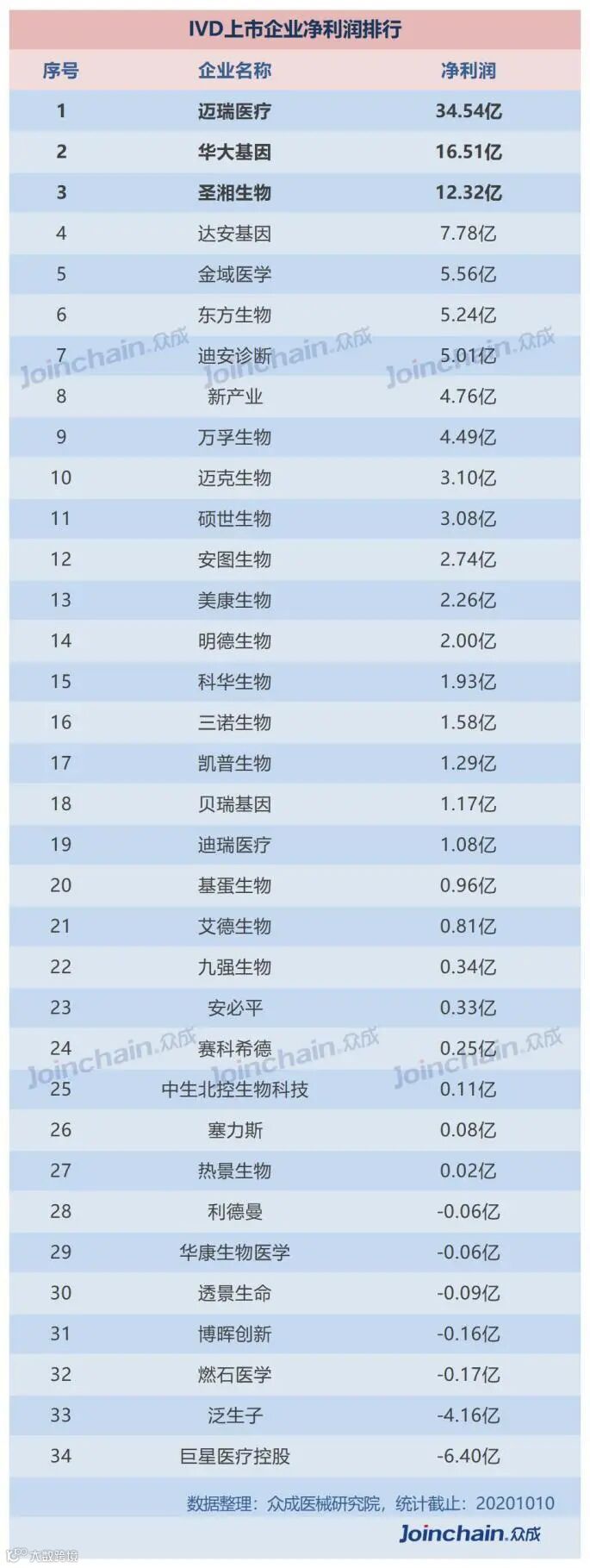 在净利润上,迈瑞医疗以超30亿元位居榜首,排名第二的华大基因与排名第三的圣湘生物,净利润均超过10亿元。