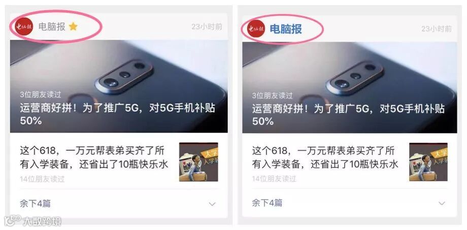 平时看到的订阅号名称颜色从黑色变成了蓝色,用户点击订阅号名称进入公众号时,还加了个简单的点击效果,体验上更舒服了~