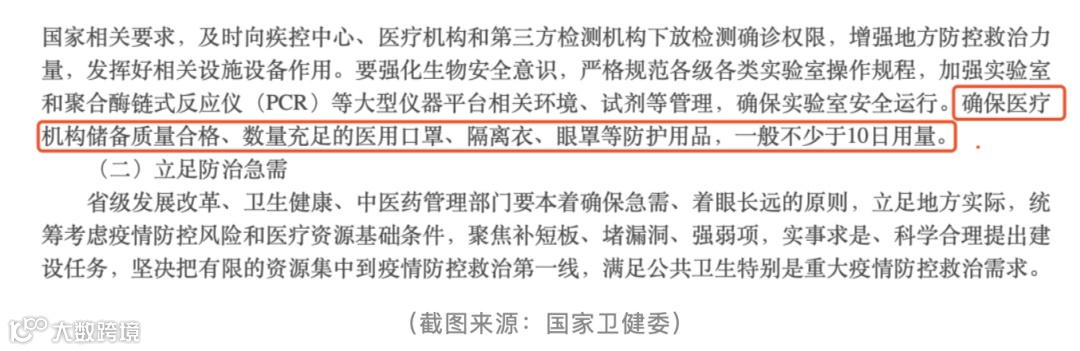 确保医疗机构储备质量合格、数量充足的医用口罩、隔离衣、眼罩等防护用品,一般不少于10日用量。可以看到,储备口罩的指令下发后,将无疑促进口罩的供应量,也将极大促进口罩的生产。