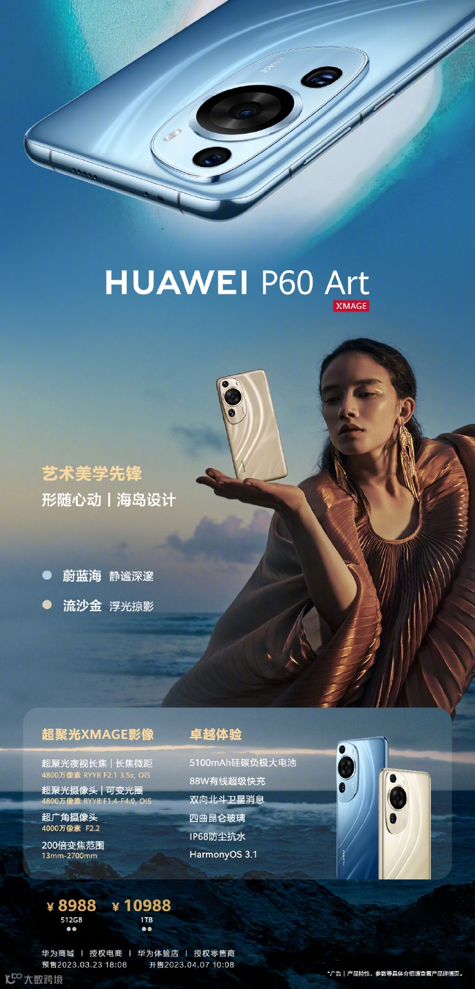 形随心动,不拘于型。#华为P60#Art设计灵感源自海岛,不规则形状镜头模组,展现自然美与科技美的结合。一半海水,一半沙滩,幻化出蔚蓝海、流沙金两款独特配色。