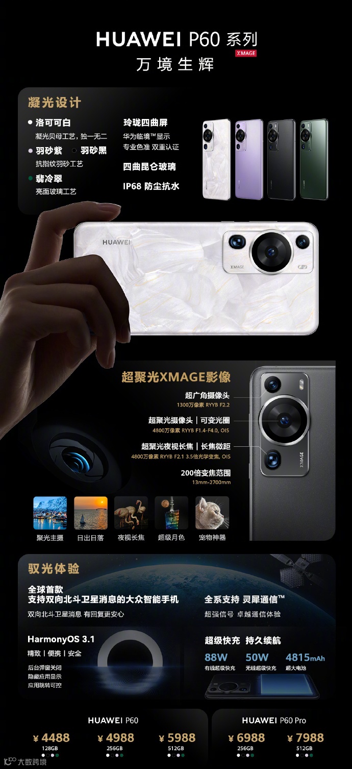 影像新生,万境生辉!#华为P60#系列业界首创超聚光主摄,F1.4-F4.0十档物理光圈,智能可变,搭配全新XD Fusion Pro质感引擎,清晰捕捉暗夜微光,日出日落,记录动人瞬间。