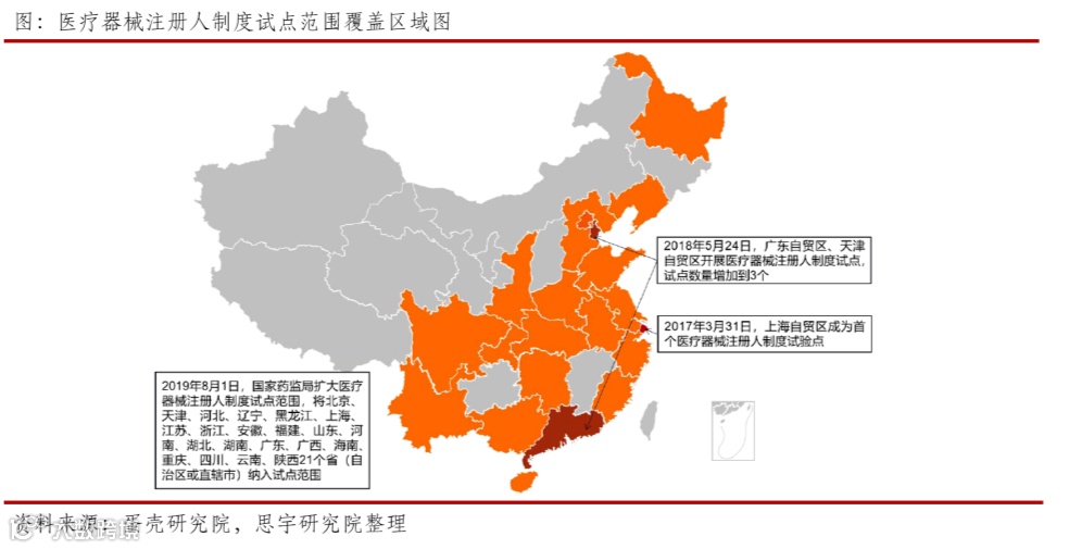 2017年,国务院印发《关于深化审评审批制度改革鼓励药品医疗器械创新的意见》,标志着医疗器械上市许可持有人制度正式在国内开始施行。此次政策组合拳从研发、临床试验、产品所有者权益和生产企业整条产业链的源头进行政策引导,鼓励药品和医疗器械的创新,简化监管流程,提升审批速度。2019年8月,国家药监局发布《关于扩大医疗器械注册人制度试点工作的通知》,将试点范围扩大至21个省市。截至2019年12月底,21个试点省市全部发布了医疗器械注册人制度实施方案。