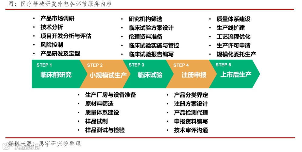 虽然各家医疗器械CRO公司侧重点各有不同,但是研发外包服务基本涵盖了临床前研究、小规模试生产、临床试验、注册申报和上市后生产五个环节。服务商根据需求的不同环节提供针对性的服务,主要包括:产品市场调研、产品研发与定型、厂房设计建设、质量管理体系建设、样品测试与检验、临床试验方案设计与实施、试验报告编写、工艺流程优化、注册申报资料编写、规模化委托生产等[2]。