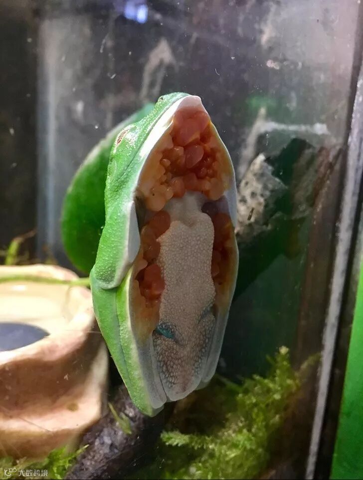 绿色的青蛙紧紧地靠在玻璃上