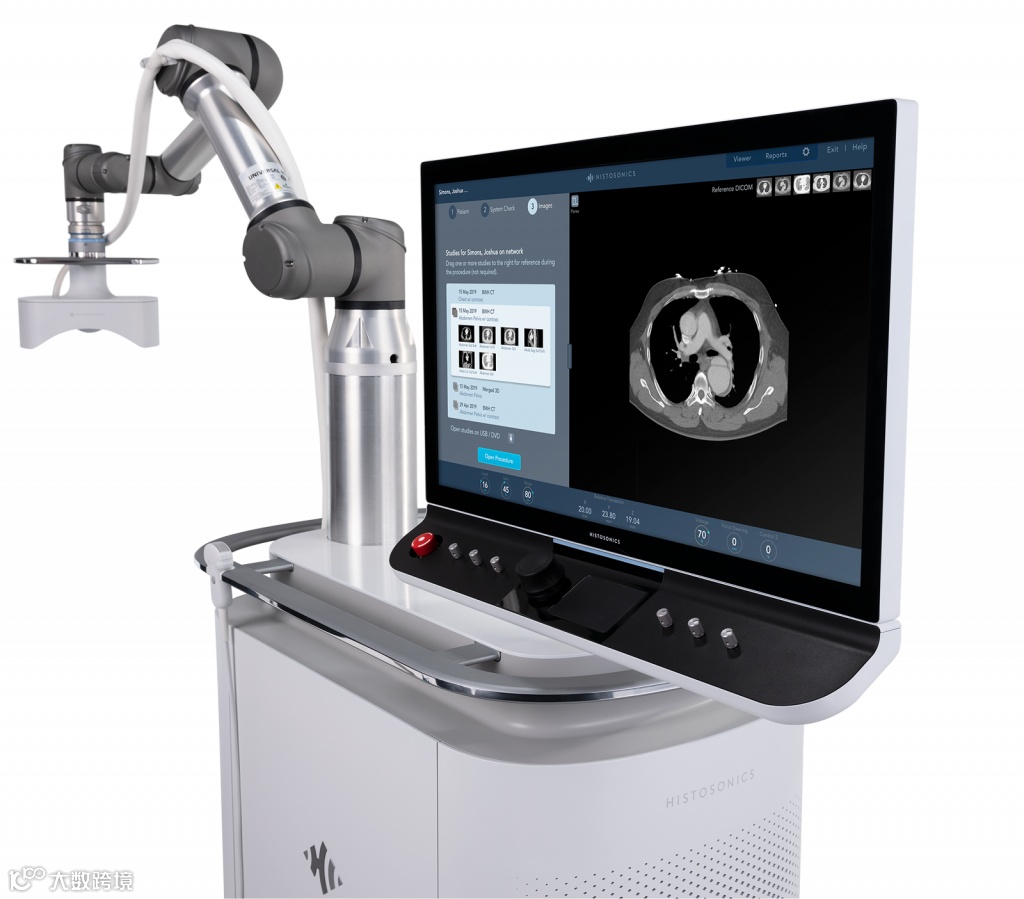 成立于2009年的HistoSonics推出的Edison就是我们今天打算介绍的图像引导超声治疗机器人。它利用聚焦声能产生压力,液化亚细胞并破坏目标组织,从而治疗病变组织和肿瘤细胞。Edison包括一个机械臂、超声探头、影像显示屏及控制面板,并且内置有微型计算机,负责影像计算和控制机械臂运动。它能将脉冲声波能量输送到人体内,而无需任何切口或针头,并且能够在亚细胞水平上破坏组织,而医生通过设备显示屏实时监测“气泡云”和治疗效果。